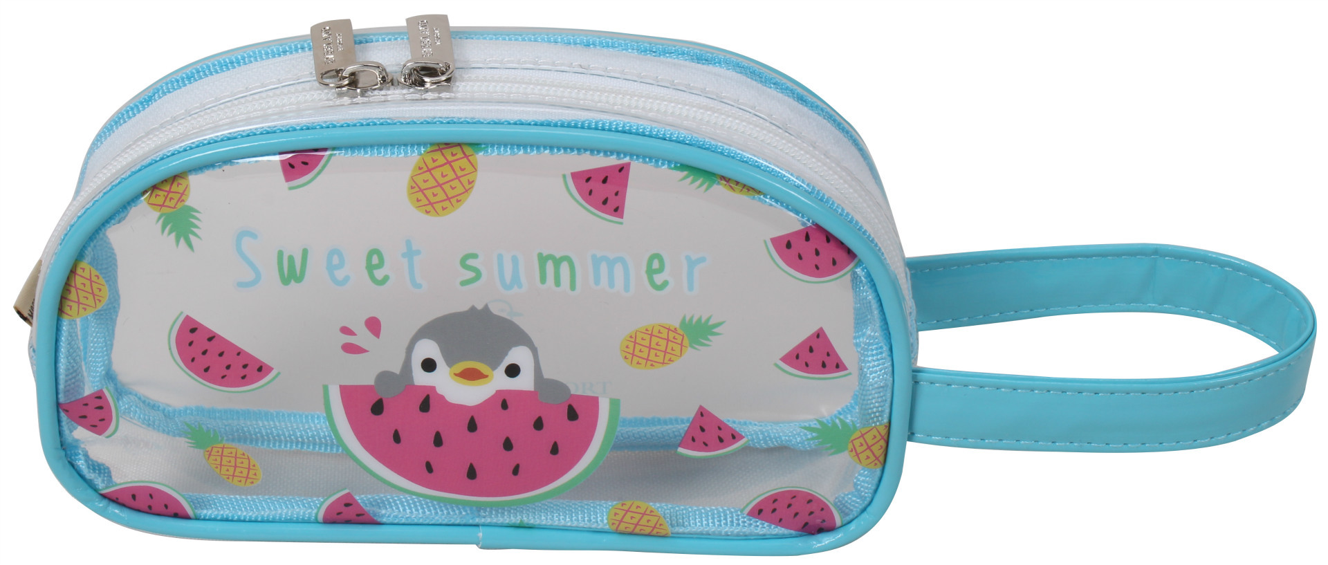 包包采用A级透明PVC材质制作而成,表面光滑,透明清晰,干湿分离,脏了直接用湿布一擦,立马还你一个干净又漂亮的可爱化妆包,正面印有立体可爱的企鹅啃西瓜,让您一见到它就感觉凉爽可口。